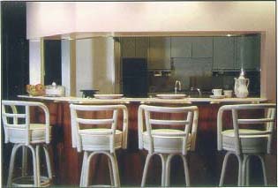 and the great room, it also serves the formal dining room. The open-through breakfast bar, bottom right photo, serves as a partition between the great room and the kitchen.