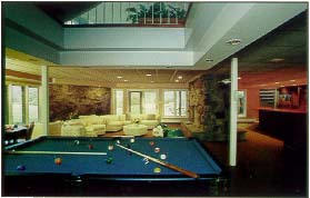 ceiling lights and a skylight some 40 feet above. The ceiling over the pool table extends up through the foyer, encompassing the openness of the main floor stairway and the third floor lounge. While maintaining