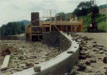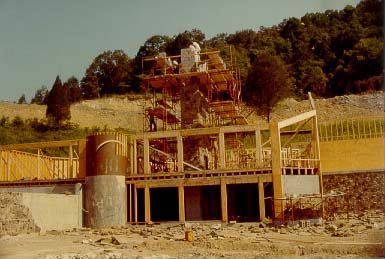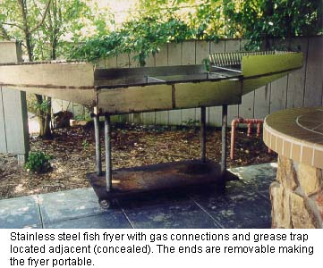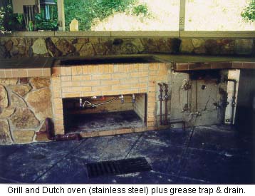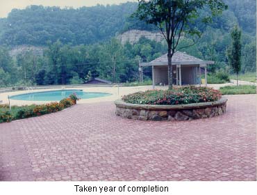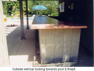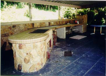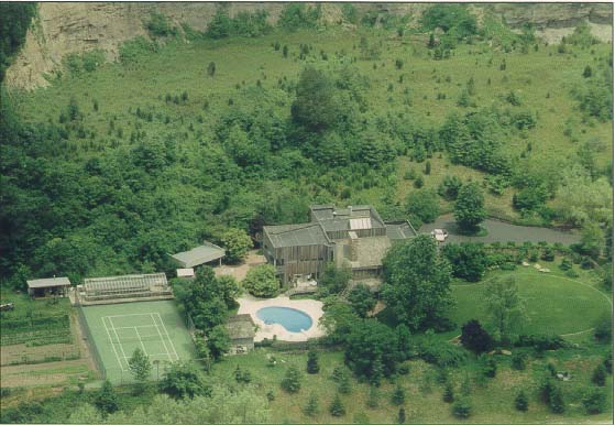There is a 30' high cliff extending completely across the triangular (from ridge to ridge), separating the natural woodland from the lower developed areas. Mr. Lawson is an avid runner and uses the estate's paved areas as a private jogging track. From the greenhouse walkway to the entrance gate with its natural incline plus the up and down of the various steps, makes for a vigorous workout, equaling approximately three miles with ten laps. He occasionally walks up the mountain, climbing to a higher plateau. This is an excellent workout or a pleasant hike through the woods while observing nature. There is something here for the most finicky enthusiast. You should never get bored with all the activity areas and possibilities—may never want to go away on vacation. The landscaping and outside entertainment and activities area are consistent with the rigid standards of the Lawson estate. OUTSIDE ENTERTAINMENT COMPLEX Architecturally designed to function as an overall working unit providing one of the grandest outdoor entertainment areas seen in a resident estate. It is an excellent place for family, an ideal venue for business and charitable entertaining on a grand scale. The estate has plenty of parking space and the entertainment complex can be accessed without actual entrance through the house itself. Cookout area. No estate would be complete without a convenient outside area in which to entertain. Special emphasis was devoted to designing a place that would include all the workings of a regular kitchen as well as those amenities unique to outside cooking. A place for grilling hot dogs and hamburgers, or preparing the family meals to lavish cooking of steaks, home baked breads, & etc., for evening entertaining to having a fish fry or just a place to sit around and relax. The Lawsons have entertained 200 people plus on different occasions, during the day as well as evening and night. It is only steps to the house main kitchen and is accessible from the driveway parking area-comfortable, safe and easy to clean. The roof of the outside complex shelter is of solid piece stainless steel corrugated beams supported by two large "I" beams which in turn are supported by four 6" tubular steel upright posts at each corner. - The intensity of the sun's rays reflecting off the stainless steel roof creates a draft that adds to the comfort of the shade underneath the shelter. By designing and constructing support posts at the two entrance corners allows for an unobstructed access to the shelter. The floor is of concrete with a built-in drain and grease trap located in front of the grill area. The counter top is constructed of 4" reinforced concrete finished with tile. Retaining wall is reinforced concrete finished with natural rock. It has its own separate power breaker box with numerous lights (bug lights included) and receptacles as well as telephone jack. For safety purposes no electricity extends lower than any of the receptacle boxes which are 5' from the ground floor. The many cooking and kitchen amenities and conveniences include: